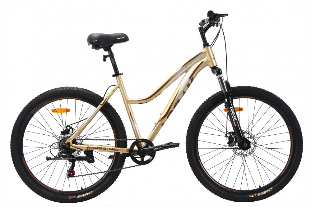 Цвет # Золотисто Серый Материал рамы # алюминий Тип тормозов # дисковый механический Диаметр колес # 27.5 Рама # 17" (на рост 155-173) Вилка # STEEL ход 80 мм, пружинно-эластомерная Количество скоростей # 7 Передний переключатель # - Задний переключатель # LTWOO A2 или Shimano TZ500 (зависит от партии) Передний тормоз # YinXIng или JAK-8 mech. disc 160 механический Задний тормоз # YinXIng или JAK-8 mech. disc 160 механический Манетки # LTWOO A2 триггер Shimano ST-EF-41 (зависит от партии) Шатуны # 1ск. 36Т 170MM алюминий Каретка # FP Feimin картридж Задние звезды # ATA 7 скоростей трещетка Втулки # сталь Shengfu подшипники насыпные или на промах (зависит от партии) Покрышки # Compas 27.5*2.0 Обода # двойной DA-18 Цепь # KMC C050 Руль # Lorak стальной 680W Вынос # Lorak стальной подъемный Подседельный штырь # Lorak 27.2*300MM Рулевая колонка # Neco резьбовая Седло # Lorak 6558 Педали # пластик FP Вес # 15,9 кг